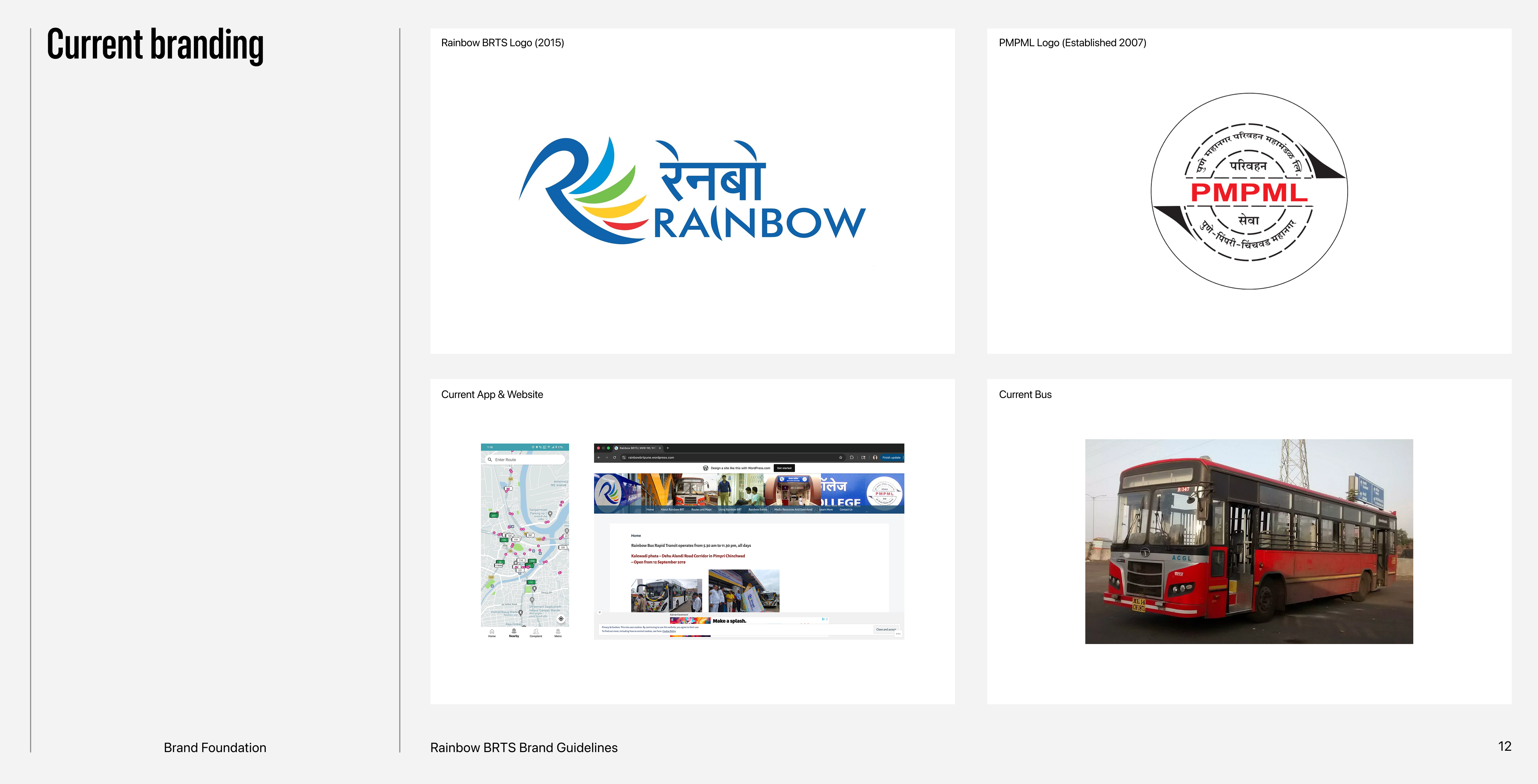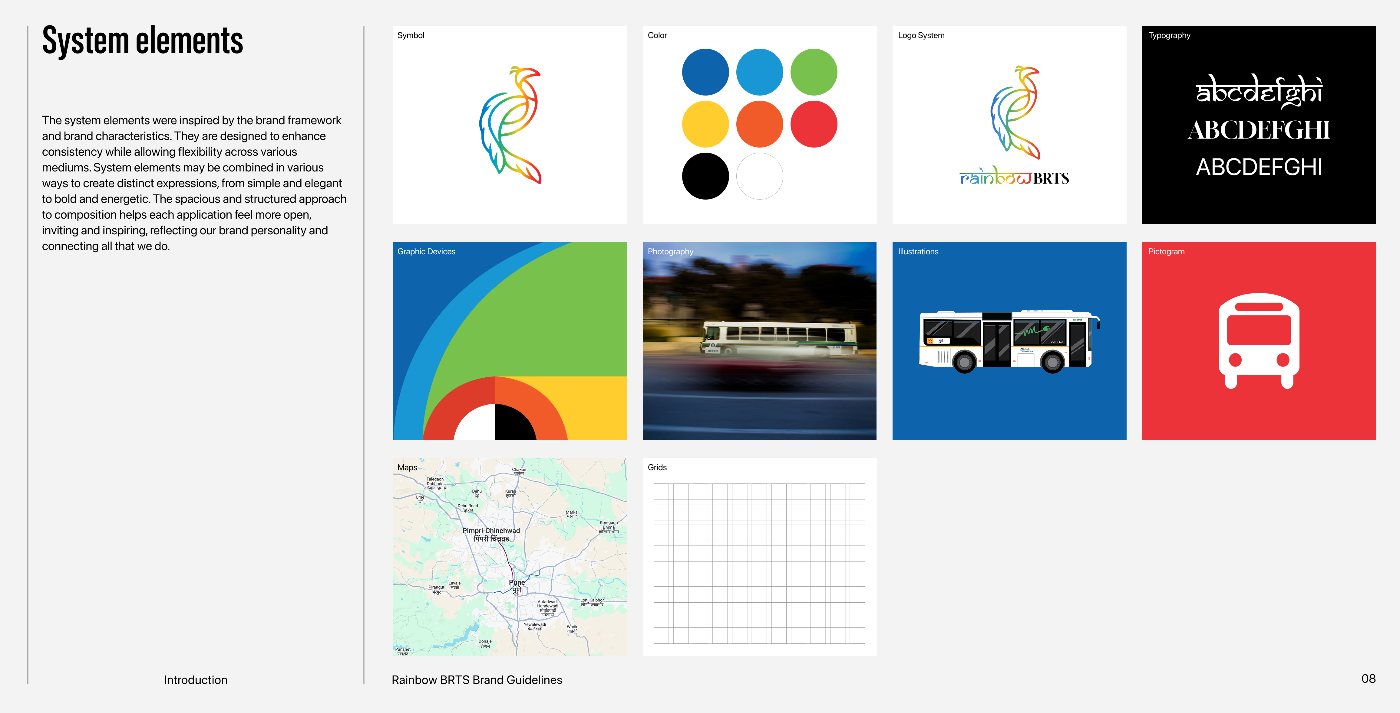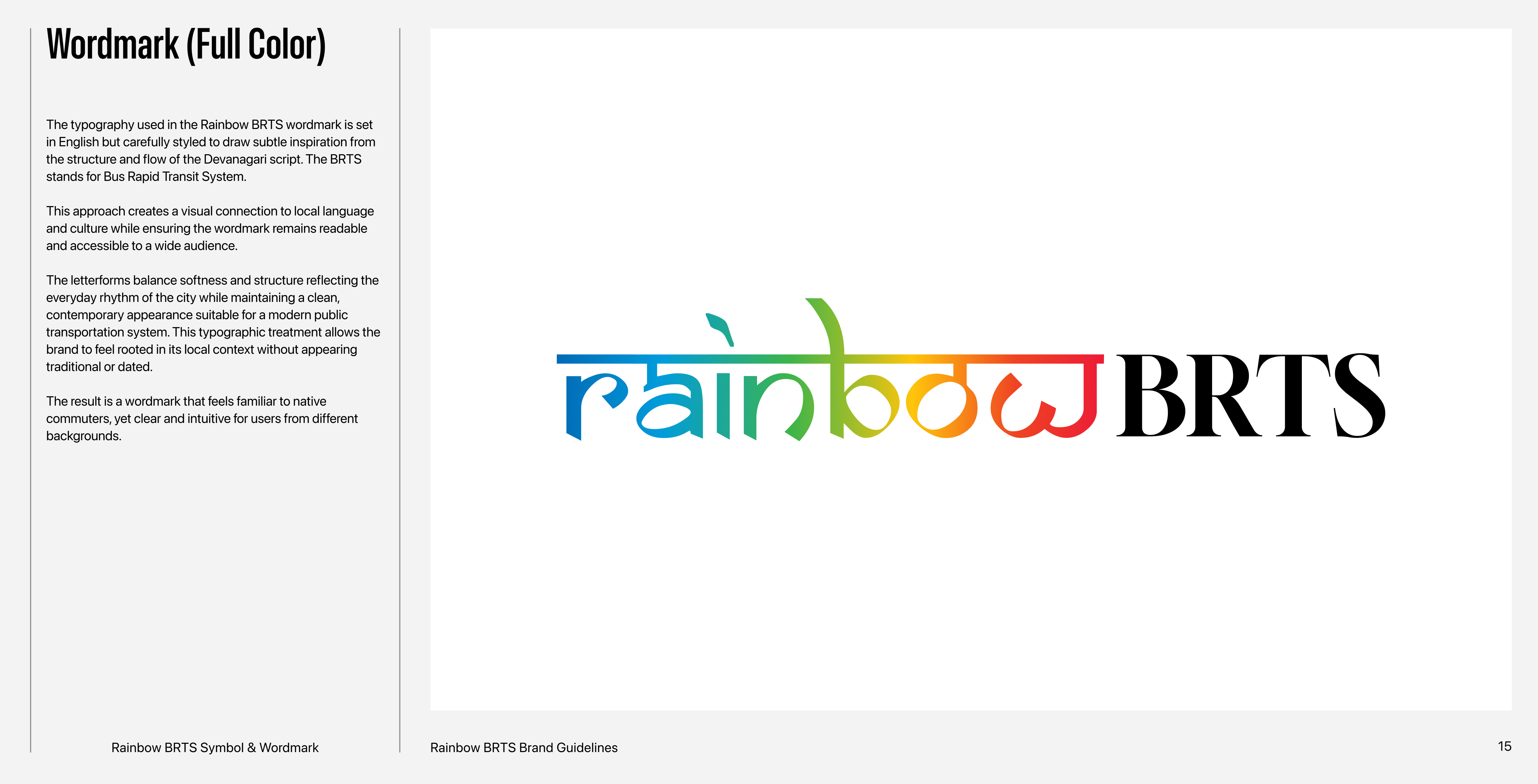 Rainbow BRTS is a public transportation system designed to simplify bus travel in Pune, India. This project features the branding and brand guide.