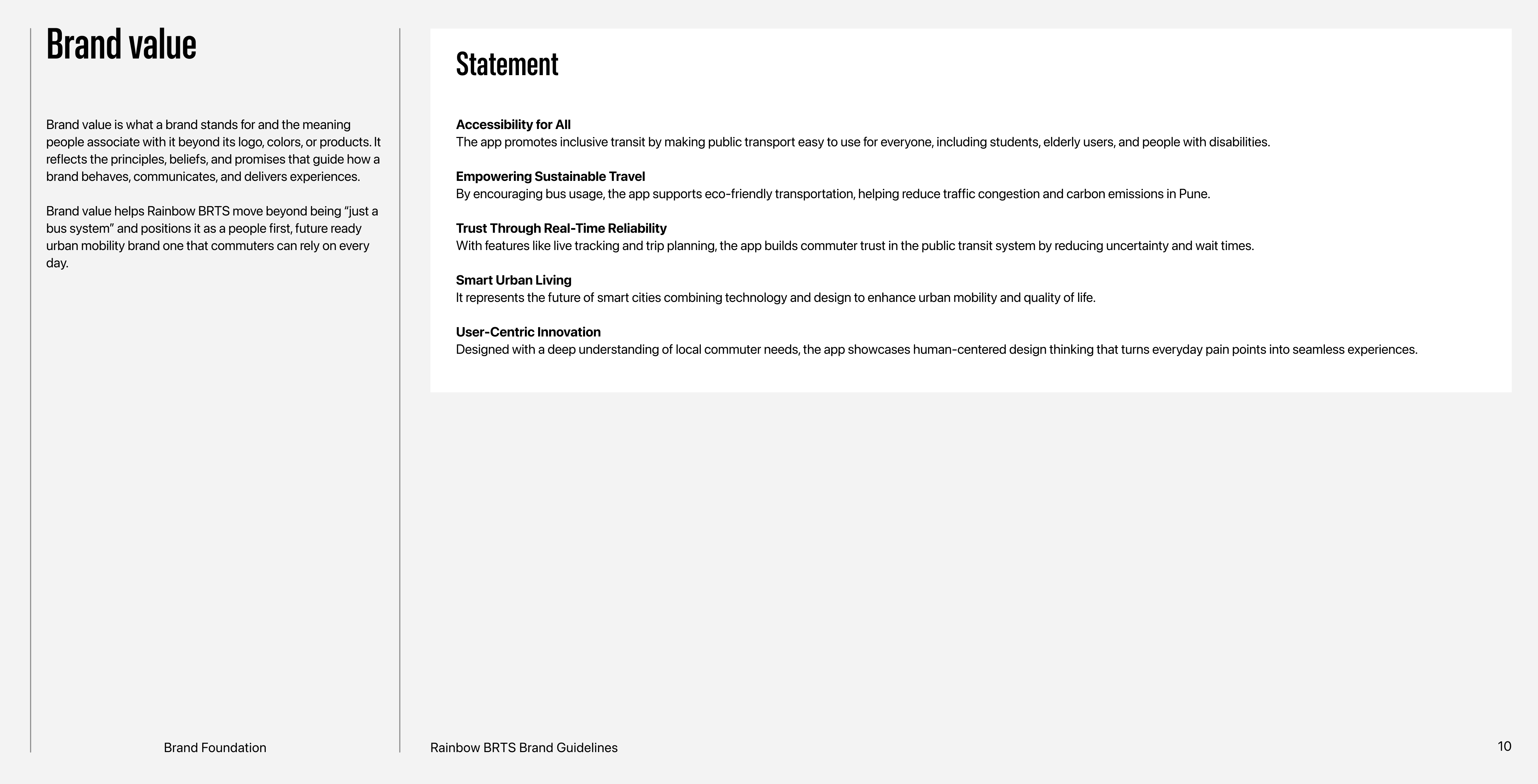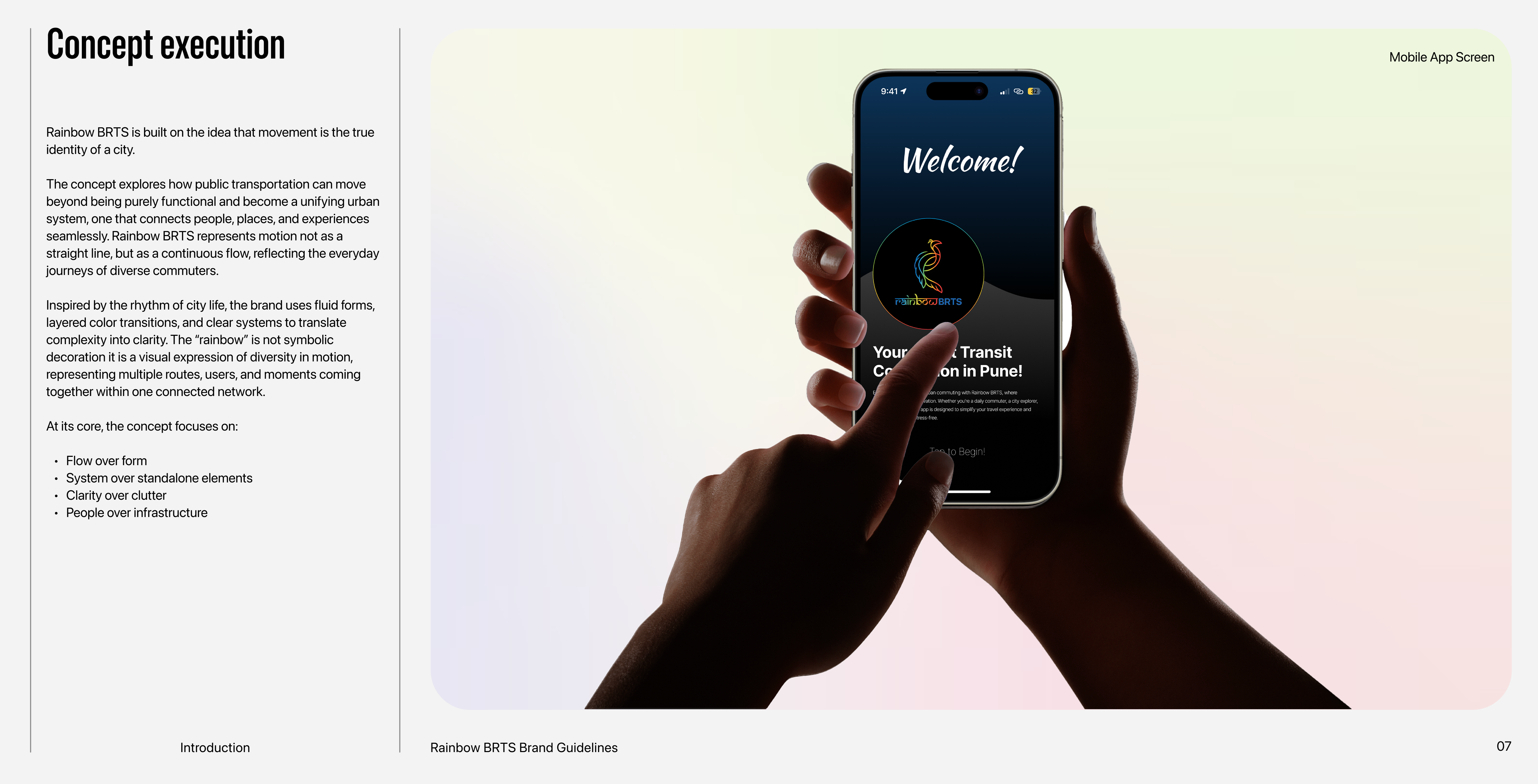 Rainbow BRTS is more than just a logo or a bus system it is a brand that brings people together and makes travel easier, safer, and more colorful for everyone in Pune. This brand book shows how the logo, colors, fonts, and design should be used to keep everything clear and consistent.